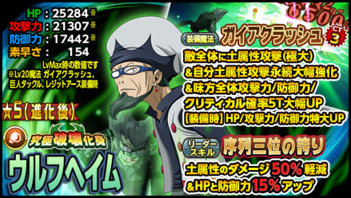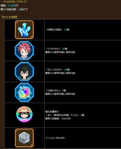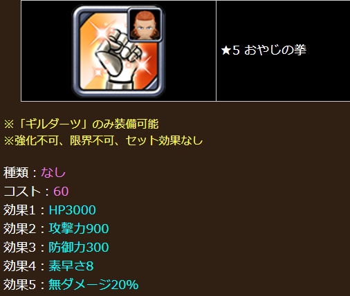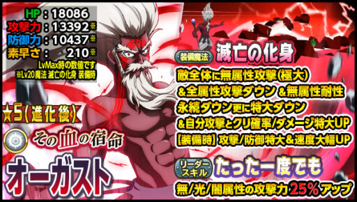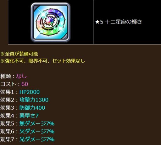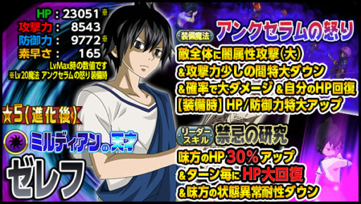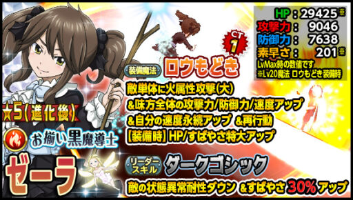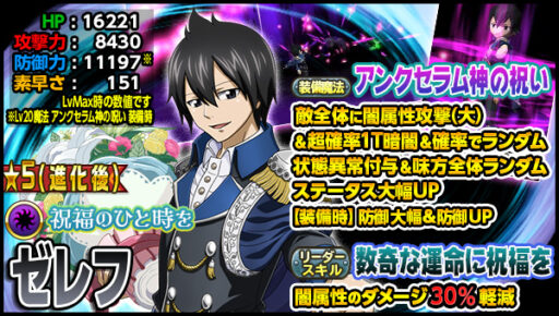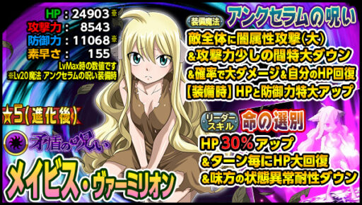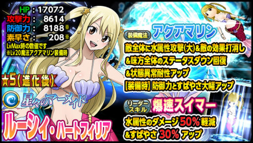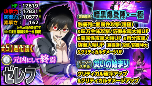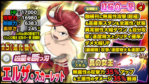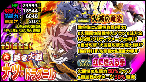 ナツ:火耐性特大ダウンと自身火属性大幅強化にクリダメアップがこの魔法1つで行える良魔法。ナツ使い的には結構必須レベルだと思う。装備時すばやさが大幅にとどまってるのは気になるけど、まあサポートキャラじゃないし良いんじゃないかなって感じ